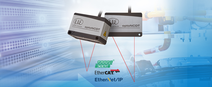 For flexible connection to control systems, the optoNCDT 1900 sensors have integrated EtherCAT, EtherNet/IP and PROFINET interfaces. With its integrated Industrial Ethernet interfaces, the sensor offers advantages particularly in high speed processes and for networking of several devices and machines.